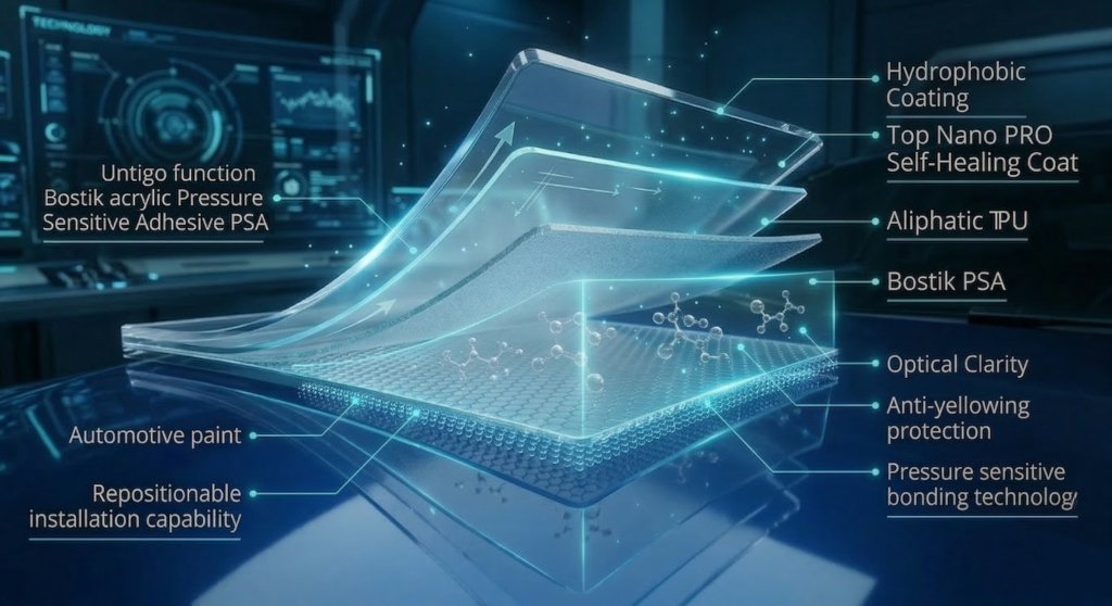 At the adhesive level, Nano Tech Pro uses Bostik acrylic Pressure Sensitive Adhesive (PSA) technology, chosen for its optical clarity, anti-yellowing performance, and installer-friendly characteristics. This allows for precise repositioning during installation, secure long-term bonding, and safe removal without residue or paint damage when required.
